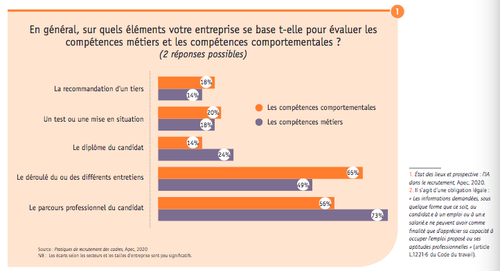 Une étude de l’APEC, réalisée en 2020 sur les pratiques de recrutement des cadres, nous permet de mieux appréhender sur quels éléments les entreprises se basent pour évaluer les compétences métiers et les compétences comportementales.